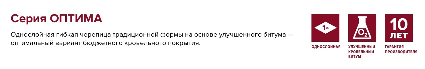 Серия ОПТИМА от ТехноНИКОЛЬ (Шинглас) — однослойная гибкая черепица традиционной формы на основе улучшенного битума. Практичное и экономичное кровельное покрытие: сочетание прочности и эластичности обеспечивает надежную защиту от влаги и погодных воздействий при минимальных затратах на монтаж и обслуживание. Идеально подходит для частных домов, хозпостроек и реконструкций, где важны доступная цена и аккуратный внешний вид.